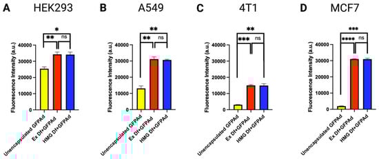 Comparative in vitro transduction of Ad liposomes manufactured by extrusion and homogenization on CAR positive and CAR deficient cell lines at MOI 50 (n = 3): (A) In vitro transduction of unencapsulated GFPAd (yellow bar) Ex Df + GFPAd (red bar) and HMG Df + GFPAd (blue bar) on CAR positive HEK293 cells (p value: ns = not significant, * ≤ 0.05, ** ≤ 0.01). (B) In vitro transduction of unencapsulated GFPAd (yellow bar) Ex Df + GFPAd (red bar) and HMG Df + GFPAd (blue bar) on CAR positive A549 cells (p value: ns = not significant, ** ≤ 0.01). (C) In vitro transduction of unencapsulated GFPAd (yellow bar) Ex Df + GFPAd (red bar) and HMG Df + GFPAd (blue bar) on CAR deficient 4T1 cells (p value: ns = not significant, ** ≤ 0.01, *** ≤ 0.001). (D) in vitro transduction of unencapsulated GFPAd (yellow bar) Ex Df + GFPAd (red bar) and HMG Df + GFPAd (blue bar) on CAR deficient MCF7 cells (p value: ns = not significant, *** ≤ 0.001, **** ≤ 0.0001).