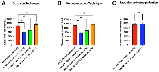 Comparative in vitro transduction of storage stability samples of Ad liposomes manufactured by extrusion and homogenization techniques on CT26 cells at MOI 50 (n = 3): (A) In vitro transduction of Ex Df + GFPAd manufactured using 1 month old Ex Df stored at 4 °C (blue bar), −20 °C (green bar), and −80 °C (orange bar), compared with freshly prepared Ex Df + GFPAd (red bar—control sample) (p value: ns = not significant, * ≤ 0.05). (B) In vitro transduction of HMG Df + GFPAd manufactured using 1 month old HMG Df stored at 4 °C (blue bar), −20 °C (green bar), and −80 °C (orange bar), compared with freshly prepared HMG Df + GFPAd (red bar—control sample) (p value: ns = not significant, * ≤ 0.05). (C) Comparative in vitro transduction of Ex Df + GFPAd (red bar) and HMG Df + GFPAd (blue bar) at MOI 50–manufactured using 1 month old aged Df stored at −80 °C (p value: ns = not significant). Note: Figure 7C is drawn using the data sets taken from (A,B).