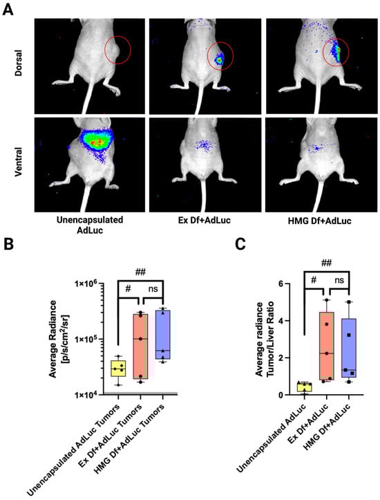 Comparative in vivo biodistribution was investigated to study transduction efficiency of Ex Df + AdLuc, HMG Df + AdLuc, and unencapsulated AdLuc via IT injections in CAR deficient CT26 tumors implanted in Nu/Nu mice. First, either unencapsulated AdLuc (n = 5) or Ex Df + AdLuc (n = 5) or HMG Df + AdLuc (n = 5) were IT injected with 1.4 × 108 PFU and imaged after 5 days using an IVIS imaging system (Figure 8A). Supporting the in vitro data, both Ex Df + AdLuc and HMG Df + AdLuc enhanced tumor transduction by 4-fold (Figure 8B). The performance of Ex Df + AdLuc, and HMG Df + AdLuc was similar (p value > 0.05). The ratio of the total tumor transduction to liver transduction for each group was compared, Ex Df + AdLuc and HMG Df + AdLuc reduced off-tumor transduction by 4-fold (p value 0.0533 and 0.0703, respectively) (Figure 8C).