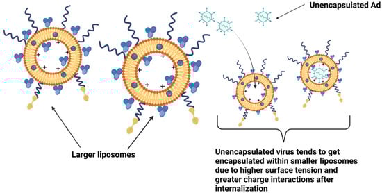 Spontaneous encapsulation of Ad in empty liposomes: unencapsulated virus tends to get encapsulated within smaller liposomes due to higher surface tension and greater charge interactions after internalization.