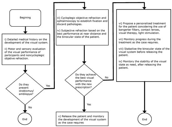 Flowchart in assessing patients, and possible treatments for individuals diagnosed with strabismus and amblyopia.