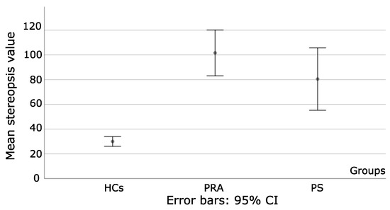Illustrates the mean values of stereopsis and s.d for each group. PS and PRA present similar degrees of stereopsis (gross stereopsis), but with greater heterogeneity for the obtained values for PS, as shown by the s.d. HCs, which show fine stereopsis, and that allow us to visualize the significant differences between healthy controls and patients with strabismus and amblyopia.
