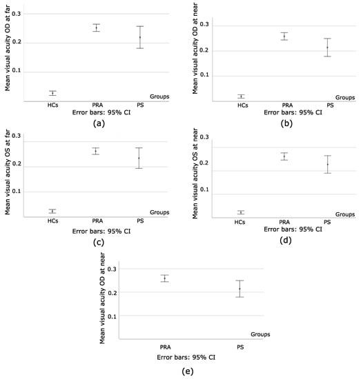 When the HCs were compared to PRA and PS, for OD, F = 92.71 at far, and F = 110.38 at near, with p < 0.001, as seen in Figure 3a,b. For OS, F = 91.93 at far, and F = 102.85 at near, with p < 0.001, as seen in Figure 3c,d. However, when PRA and PS were compared, at far, p = 0.18 (OD) and p = 0.35 (OS) while at near, p = 0.03 (OD) and p = 0.16 (OS), as seen in Figure 3e. To summarize, HCs had a better visual acuity for both eyes at both distances, whereas statistically significant differences between PRA and PS were only found on the amount of visual acuity of the right eye at near distance.