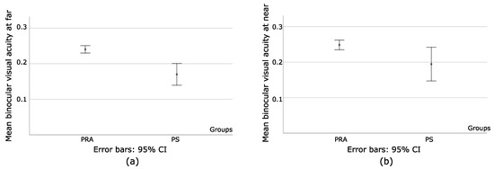 An independent Sample t-Test was used to compare the means of binocular visual acuity at far (BVAF) and binocular visual acuity at near (BVAN) between PRA and PS. Statistically significant differences were found at far (t = −4.31 and p < 0.001) and near (t = −2.2 with p = 0.03), showing that PS had better binocular visual acuity (BVA) at both distances, as seen in Figure 4a,b. Once more, the mean and Std values for PS indicate the heterogeneity of the values of BVAF and BVAN.