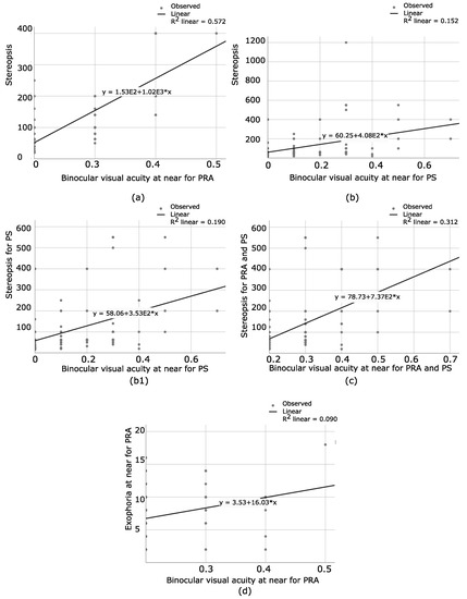 (a) Represents the relationship between the degree of stereopsis and the amount of binocular visual acuity at near for PRA. As the visual acuity at near decreases, the degree of stereopsis diminishes. (b) The relationship between the degree of stereopsis and the amount of binocular visual acuity at near for PS. Worse stereopsis is obtained in patients with lower visual acuity at near distance. (b1) The relationship between the degree of stereopsis and the amount of binocular visual acuity at near for PS, after excluding the only patients with gross stereopsis. R2 increases, which means that the linear relationship becomes stronger. As visual acuity at near decreases, stereopsis deteriorates. (c) The relationship between the degree of stereopsis and the amount of binocular visual acuity at near when PRA and PS with amblyopia and stereopsis were put together. There is an important linear relationship, where patients with worse visual acuity at near obtain lower values of stereopsis. (d) Shows the relationship between the amount of binocular visual acuity at near and the exophoria state in PRA. A higher degree of exophoria is obtained in patients with lower visual acuity at near, which clarifies that the phoria state deteriorates as the visual acuity at near diminishes.