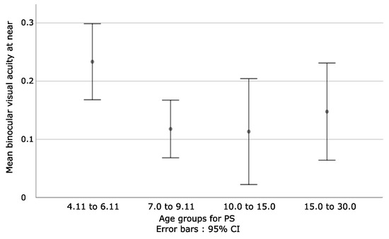 Represents the mean binocular visual acuity at near, defined by age groups for PS with stereopsis. What stands out is that younger children obtain lower values when compared to older ones. However, more heterogeneities for the obtained values are observed in the third and fourth groups, which are probably related to the time spent to make adaptations.