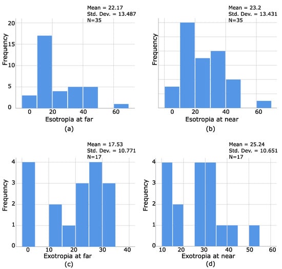 To understand the characteristics of stereoblind patients, the distribution of frequencies of the magnitudes and types of strabismus were analyzed. They were 53 stereoblind patients, 35 with ET (far and/or near), and 17 XT (far and/or near). Additionally, six patients had hypertropia as a secondary deviation, and only one had pure HT. Figure 6a–d illustrates the results of such a distribution. As seen from Figure 7a,b, 35 patients with ET were stereoblind, which means that ET patients have a greater tendency of being stereoblind. On the contrary, only 17 patients with XT were stereoblind, and a greater amount of deviation is necessary for patients with exotropia to be stereoblind (Figure 7c,d). HT was not graphed as being a secondary deviation.