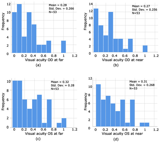(a–d) Presents the distribution of frequencies of the amount of visual acuity of the right and left eye at far and near in stereoblind PS. As can be seen, even strabismic patients without amblyopia can be stereoblind, which reaffirms that the amount of visual acuity does not predict the presence or absence of stereopsis.
