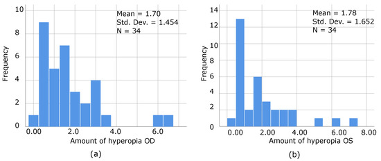 The frequency distribution of the amount of hyperopia for each eye was graphed as well, as illustrated by Figure 9a,b, where even patients with a low degree of hyperopia can be stereoblind, as confirmed by the following graphs.