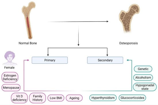 Osteoporosis has been classified as primary and secondary osteoporosis based on etiological factors (Figure 1). Primary osteoporosis may occur in both sexes but is more prevalent in postmenopausal women, while secondary osteoporosis results from pathological conditions such as hypogonadism or celiac diseases, and drugs such as glucocorticoids []. Osteoporotic fractures have many risk factors, including low peak bone mass, hormonal factors, use of steroidal medications, cigarette smoking, lack of physical activity, low intake of calcium and vitamin D, race, small body size, and a personal or family history of fracture [,]. In postmenopausal women, osteoporosis causes increased hip and vertebral fractures and a higher risk of falls. This further causes mortality and morbidity in postmenopausal women [].