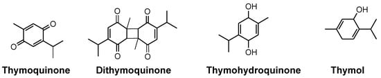 NS is a dicotyledonous plant belonging to the Ranunculaceae family. It is also known as “crowfoot” or “buttercup”. Ranunculus is the largest genera from the family of more than 2000 flowering plants, with 43 genera widely distributed around the globe []. Reports about the chemical constituents of NS suggested the presence of oils, carbohydrates, proteins, and fibres []. Several experimental studies have suggested the medicinal importance of NS, which is primarily due to the presence of quinone constituents (TQ) [,]. Large amounts of carbohydrates, proteins, fats, vitamins, minerals, and fiber make the seed nutrition rich. Several amino acids have also been detected in the plant, such as aspartate, glutamate, arginine, methionine, and cystine. Vitamins identified in black seed include folic acid, niacin, thiamine, and pyridoxine. Minerals such as calcium, iron, phosphorus, zinc, and copper are also found in it. A phytochemical investigation of black seeds revealed the presence of sterols, alkaloids, essential oil, and saponins. The seeds of this herb contain palmitic acid (20.4%) and linoleic acid (64.6%) as primary fatty acids in a fixed oil (26–34%). From the nutrient pool of NS, the bioactive compound TQ has been identified as possessing significant medicinal potential. Extensive research has been conducted, and is ongoing, in order to establish and validate the benefits of NS and its constituents, as claimed historically []. Apart from TQ, NS also contains limonene, thymol, p-cymene, carvacrol, 4-terpineol, α-pinene, longifolene, and t-anethole benzene, thymohydroquinone, dihydrothymoquinone, carvacrol, thymol, α-thujene, α-pinene, β-pinene, t-anethole, and γ-terpinene as volatile principles []. Some of the important constituents of NS have been illustrated in Figure 2.