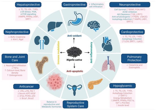 Detailed pharmacological profile of N. sativa and summary of its protective mechanisms in various organ-based diseases. Up arrow (↑) indicates increase in level and down arrow (↓) indicates decrease in level. “Image created with BioRender.com”.