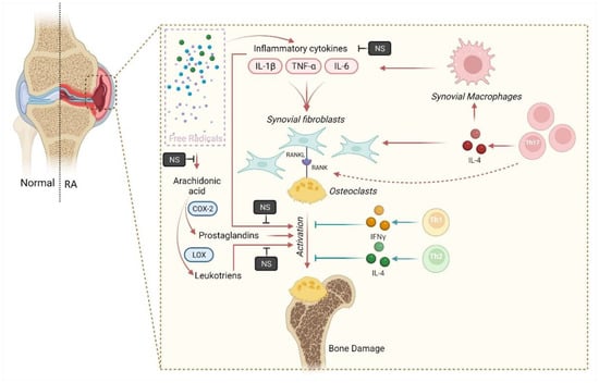 Anti-inflammatory activity can prove to be very effective in reducing osteoporosis, as experimental findings suggest a direct link between inflammation and osteoporosis [,]. A higher incidence of osteoporosis was associated with inflammatory conditions such as ankylosing spondylitis, RA, and systemic lupus erythematosus [,,,]. There is a negative correlation between C-reactive protein, a marker of systemic inflammation, and bone density, suggesting inflammation’s role in reducing bone density, i.e., osteoporosis. Interestingly, it was noticed that systemic inflammations result in general bone loss, whereas local bone loss is restricted to only the region of local inflammation []. Upregulation of age-driven proinflammatory cytokines, gouty arthritis, RA, and psoriatic arthritis can also exacerbate osteoporosis progression [,,,,,]. The consolidated mechanistic perspective of N. sativa against osteoporosis associated with RA is illustrated in Figure 4.