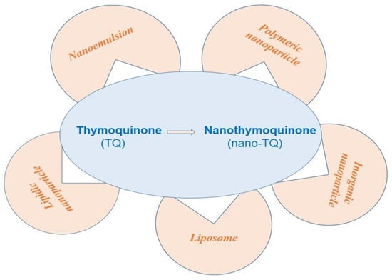 Nanotechnology is a promising approach to improving the biopharmaceutical performance of low bioavailable, bioactive molecules of plant origin []. The therapeutic efficacy of TQ encapsulated inside various nanoformulation systems (illustrated in Figure 5) as nano-TQ resulted in a significant increase in intended pharmacological activity compared to the conventional TQ formulation system [].