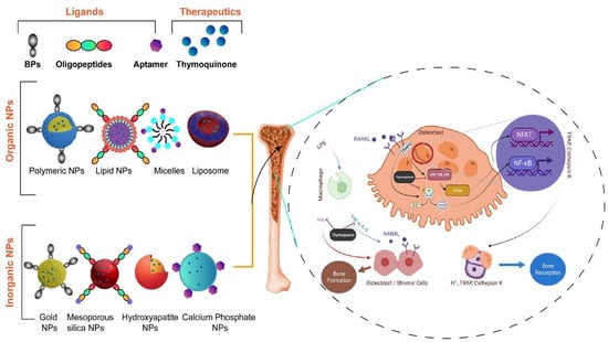 Nanotechnology is utilized as a promising approach for bone-specific drug delivery, which may include organic and inorganic nanoparticles (NPs). The example of NPs of organic nature may consist of polymeric NPs, lipidic NPs, micelles, liposomes, etc. In contrast, NPs of an inorganic nature may consist of metallic NPs, mesoporous silica NPs, hydroxyapatite NPs, calcium phosphate NPs, etc. Different types of targeting ligands (such as bisphosphonates (BPs), oligopeptides, aptamers, etc.) are conjugated with the nanoparticulate system for bone-specific targeted delivery, ultimately further helping to improve the efficacy of loaded therapeutics (pharmaceuticals and/or phytopharmaceuticals) to alleviate the side effects of conventional therapy []. The bone-specific targeted delivery of NS components and its active constituent TQ in exploiting a ligands-conjugated nanoparticulate system could be promising for the better management of osteoporosis (illustrated in Figure 6).
