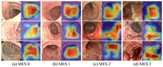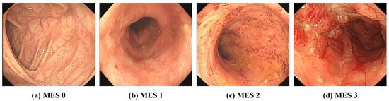 At present, the most commonly used evaluation index for assessing the severity of UC in clinical practice is the Mayo score [8], and the Mayo endoscopic subscore (MES) is the most important component of the overall Mayo score [6,9]. The MES evaluates the degree of damage to the intestinal mucosa. As shown in Figure 1, the MES classifies mucosal injury into four levels: normal or inactive, mild disease, moderate disease, and severe disease. However, the use of the MES for endoscopic evaluation is difficult and requires that endoscopists be trained. The reliance on subjective interpretations by endoscopists also hinders the reliability and repeatability of MES classification [10,11]. In addition, inexperience and review fatigue may lead endoscopists to misjudge the severity of UC, which may result in delayed treatment and missing the best time to change treatment decisions. However, artificial intelligence technology has been used to assist endoscopists in the rapid and accurate determination of UC severity classification.