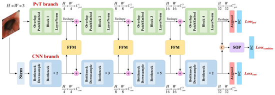 The proposed model is illustrated in Figure 2. The model has a dual-branch structure, which consists of a PvT branch, a CNN branch, a feature fusion module (FFM), two dual-branch classifiers, and a fusion classifier based on second-order pooling (SOP). The structure of the PvT is described in detail in Section 3.2, while the CNN branch is based on the ResNet50 architecture. The PvT and ResNet50 model were both pretrained on the ImageNet dataset. In a colonoscopy image, the local features extracted by the CNN represent the relationship between the intestinal wall at the near-shot point and the coaxial extension line, while the global representations modeled by the PvT capture similar information in the cross-section space of the intestinal cavity. The FFM enhances the visual representation ability by combining local features with global representations in an interactive manner. The PvT and CNN branches both contain four stages, and the FFM performs feature fusion on the output from Stages 1 to 3. Then, the fused features are transmitted back to the two main branches. The model has three outputs: the auxiliary outputs of the dual branches adopt average pooling, while the outputs of the fourth stage are concatenated and spliced at the channel level and serve as the main output of the model after SOP and the fully connected (FC) layers. Therefore, the total loss of the model includes the sum of three losses, = + + , and the cross-entropy loss function with label smoothing is applied for all losses. , , and are the weight coefficients of the three losses, respectively, and their proportions are discussed in Section 4.1. Suppose that the true label corresponding to the n-th sample is , and is the final output of the network, that is the prediction result of sample n. The calculation is expressed as follows: