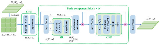 Depthwise convolution is introduced into the convolution feed-forward network to capture the local continuity of the input tensor. The dimensional decay factor between the two fully connected (FC) layers at the i-th stage is . In our study, the settings of d, h, , and in the four stages were [64, 128, 320, 512], [1, 2, 5, 8], [8, 4, 2, 1], and [8, 8, 4, 4], while the numbers of basic component blocks in the four stages were 3, 8, 27, and 3.