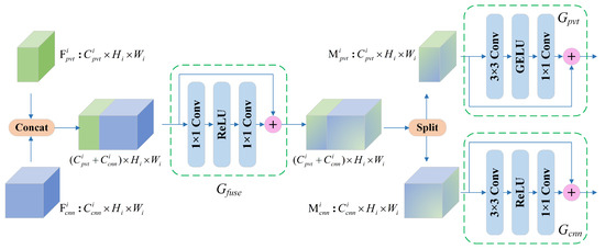 As shown in Figure 2, we developed a complementary design between the two branches, namely the feature fusion module (FFM). The structure of the FFM is illustrated in Figure 4. The FFM receives feature maps from the PvT and CNN branches, and after the fusion at the channel scale, the output is sent back to the two main branches to enhance the complementary representation. Concretely, and are intermediate feature mappings from the PvT and CNN in stage i, which are aggregated by :