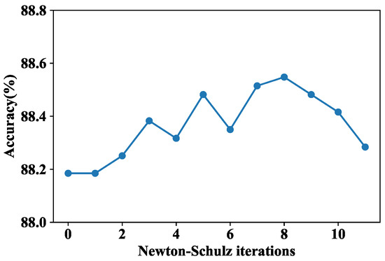 In the final feature fusion process, the Newton–Schulz iterative procedure was applied to achieve fast covariance normalization, where the number of iterations was a tunable hyperparameter. Therefore, we first explored the impact of the number of Newton–Schulz iterations L on model performance. The results are shown in Figure 6, where L = 0 indicates that SOP was not adopted. When L = 1–8, the accuracy fluctuated to some extent, but the overall trend was rising. After L = 8, the overall accuracy decreased, indicating that increasing the number of iterations is not conducive to improving accuracy, which is consistent with the discussion in [37]. Therefore, in our final model, L was set to 8.