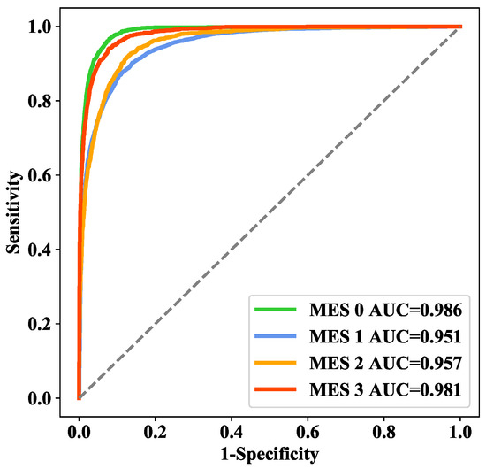 The results of the ablation experiments are shown in Table 4. Compared with the branch structure alone, the model was able to combine the local features extracted by ResNet50 with the global representations modeled by the PvT to achieve better classification performance. The overall accuracy of ResNet50, the PvT, and the model were 86.01%, 87.29%, and 88.91%, respectively. A performance comparison of some representative CNN models is shown in Table 5. Compared with ResNet50, ResNet101 had no significant improvement in terms of the recognition performance, suggesting that increasing the network depth did not enhance the representations of discriminant features. Considering the balance between performance and efficiency, our proposed model adopted ResNet50 and the PvT as the two main branches and outperformed both individual models. The ROC curves of the five models on the test set are shown in Figure 8, and the AUC values of the model for MES 0, MES 1, MES 2, and MES 3 reached 0.996, 0.972, and 0.990, respectively.