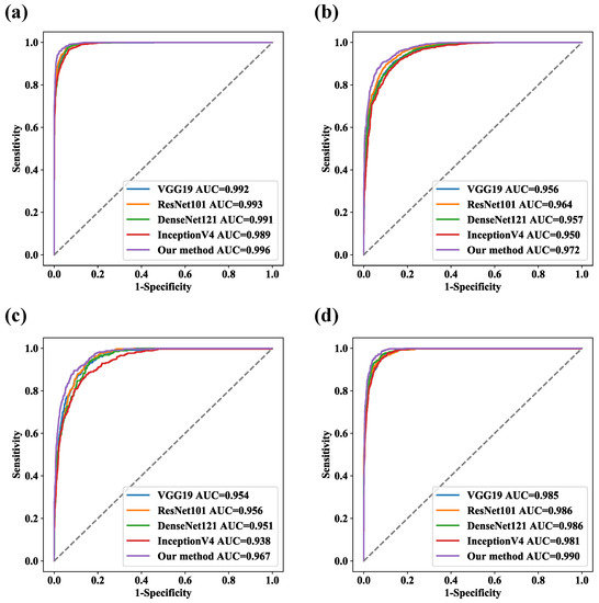 In addition, we also explored the proportion of weight coefficients , , and for the three losses: , , and . Intuitively, we believed that was more important, and the experimental results are shown in Table 3. To a certain extent, increasing the weight of can effectively improve the performance of the model. Therefore, we applied :: = 1:1:2 in our final model. On the training set, 5-fold cross-validation was applied to select various parameters for model training, and the area under the receiver operating characteristic curve (AUC) values of each class in the cross-validation analysis were 0.986, 0.951, 0.957, and 0.981 (Figure 7), while the overall accuracy was 85.45%.