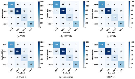 Even the basic ViT (ViT-B) exhibited better prediction accuracy than most CNNs. Moreover, compared to the ViT-B, the the PvT, which learns higher-resolution representations, improved the overall accuracy by approximately 1.0 percentage points and exhibited performance comparable to that of the basic Swin Transformer (Swin-B) [44]. In order to highlight the advantages of the model, we also compared it with advanced models such as the VAN [45] and MViT [46], and Conformer [31], as a representative of the two-branch CNN-Transformer structure, was also included in our comparison scope. The results are shown in Table 6, from which we can find that the VAN did not achieve exciting performance. In comparison, the Swin-B , MViT, and PvT performed better, which implies that the effectiveness of the pyramid structure and the overlap and transformation of patches may be beneficial for learning diffuse lesions. The confusion matrices of the six models are shown in Figure 9, visually illustrating the differences in their predictions. Compared with the Swin-B, the model had slightly higher false negatives for MES 1 and false positives for MES 3, but the Swin-B was more likely to predict MES 0 as MES 1 and MES 3 as MES 2. As a trade-off between recall and precision, the F1-score considers the false positive and false negative rates, and the model had better F1-scores than the comparison models in all categories.