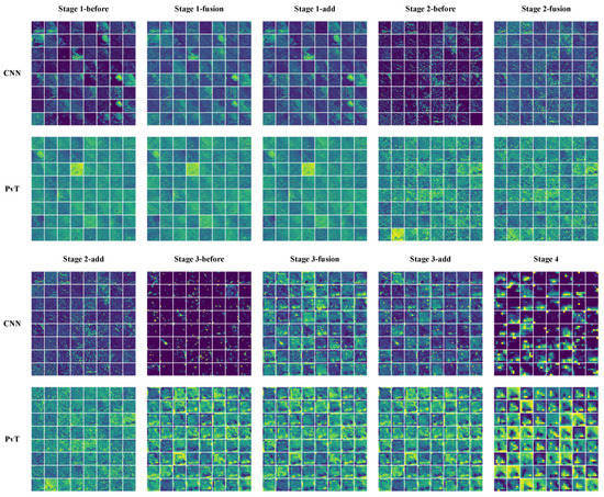 Partial feature maps before and after fusion at each stage. before: feature maps before fusion, fusion: feature maps after fusion, add: the blended features are superimposed on the original image and are also the input for the next stage.