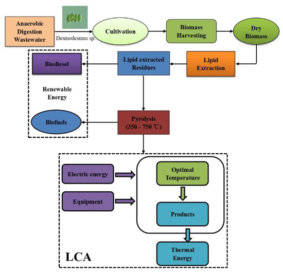 - Li, G.; Ji, F.; Zhou, Y.G.; Dong, R.J. Life cycle assessment of pyrolysis process of Desmodesmus sp. Int. J. Agric. Biol. Eng. 2015, 8, 105–112. [Google Scholar] [CrossRef]