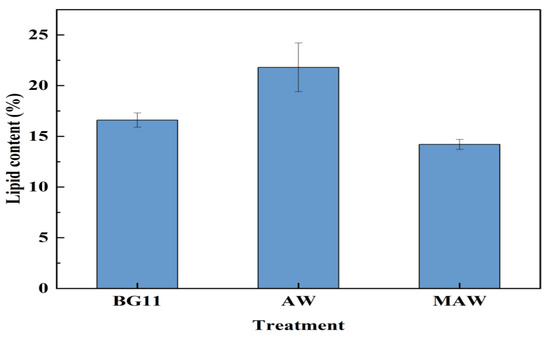 Overall, culturing microalgae with AW can obtain the highest lipid accumulation (21.8%, Figure 2). Furthermore, the microalgae cultured in the modified anaerobic digestion wastewater (MAW) had the highest biomass production (0.78 ± 0.01 g/L) compared with those (0.35–0.54 g/L) in the other two groups. The outcomes demonstrated that anaerobic digestion of wastewater could increase lipid accumulation when used to cultivate microalgae. Tan et al. [32] explained that the anaerobic wastewater had balanced nutrients with many trace elements that were not present in the medium, but the low content of trace elements such as P, Fe and Mg in AW could not guarantee the rapid growth of microalgae. Those nutrients are all necessary for photosynthesis at the growth stages of microalgae, therefore, the biomass production of microalgae with the addition of P and Mg was the highest in MAW [32]. However, the lipid content (14.2%) of microalgae decreased after culturing in MAW. The main elements added to the modified medium were Mg and P, and P could promote lipid accumulation [33]. However, Mg was related to photosynthesis, and microalgae might first choose to accumulate carbohydrates instead of lipids in the case of sufficient carbon sources [34]. Therefore, it was possible that lipid content was lower in modified wastewater. In this experiment, the lipid productivity of microalgae in MAW was higher than that found in the study by Chinnasamy et al. [35], which may be due to the nutrient shortage in the medium during the microalgae growth.