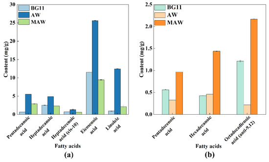 Contents of fatty acids in microalgae harvested by the three culture methods; (a) Pentadecanoic acid, Heptadecanoic acid, Heptadecenoic acid (cis-10), Eicosenoic acid and Linoleic acid, and (b) Pentadecenoic acid, Hexadecanoic acid and Octadecadienoic acid (anti-9,12).