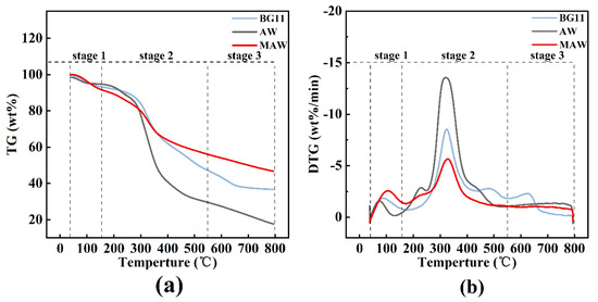 TGA data, meanwhile (Figure 4a), added to the argument. In comparison to those harvested in BG11 and AW, microalgal residues harvested in MAW medium showed a slower rate of weight loss throughout the pyrolysis stage. Due to the continuing decompositions and carbonizations of AR, TG decreased slowly at the stage above 550 °C [37]. Microalgal residues obtained from the MAW had the highest contents of C (Table 1), which improved the thermal resistance of the AR and resulted in the highest amounts of thermal residues (46.75 wt%) [38]. Notably, the contents of N and S were also elevated in the group of MAW, indicating a potential higher production of harmful compounds, e.g., NOx, SO2, and HCN, during pyrolysis or subsequent combustion and upgrading processes. Therefore, a pyrolysis compound analysis for both valuable and toxic compounds was conducted.