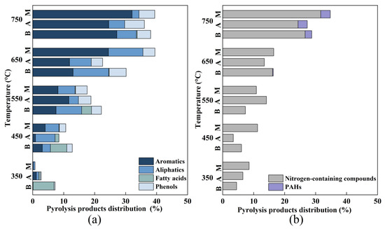 Among all pyrolysis products, aliphatic hydrocarbons are some of the products with economic value, which have great significance in the production of bio-oils. The percentage of valuable compounds in the pyrolysis products of microalgal residues from the MAW medium increased as the pyrolysis temperature rose from 350 to 750 °C and showed a single peak at 650 °C (39.47%, Figure 5a, Table A4 in Appendix D); compared with results of the BG11 (38.08%, 750 °C) and AW (36.05%, 750 °C) groups, MAW groups significantly reduced the pyrolysis temperature of optimal content and increased the relative content of valuable compounds in the pyrolysis products. The content of valuable compounds obtained by pyrolysis in microalgae residues from the MAW medium (39.47%) was higher than that from original anaerobically digested effluent medium (19.83%). The results agreed with the previous study that the content of valuable compounds from pyrolysis production in MAW medium increase by adding chemical components (ammonium ferric citrate, dipotassium hydrogenphosphate, and magnesium sulfate heptahydrate) [12]. Moreover, aromatic hydrocarbons in pyrolysis products are also high-value compounds, which can be used as transportation fuel additives in industry, and can also elevate octane numbers, thereby enhancing combustion efficiency [40]. The results showed that contents of aromatic hydrocarbons in the pyrolysis products of three groups of AR showed similar trends; aromatic hydrocarbons were the most abundant components in all pyrolysis products, and achieved the maximum value at 750 °C with the increase of pyrolysis temperature. The contents of aromatic hydrocarbons in the pyrolysis products of ARs in both BG11 (27.16%) and AW (24.54%) media were all lower than those in the MAW (32.07%) groups by comparison.