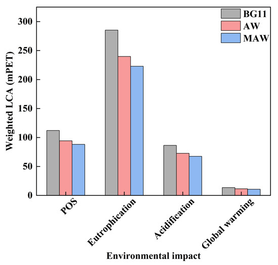LCA was applied to the process of pyrolysis of microalgal residues in three media at the optimum pyrolysis temperature (650 °C), and the pyrolysis of ARs in the BG11 medium required the most energy (7463.5 MJ/kg); directly using anaerobic digestion wastewater (AW) reduced the required energy by 15.93%, and in the modified anaerobic digestion wastewater (MAW) group, it was further reduced by 7.09%. This was mostly related to an increase in biomass output in wastewater that had been modified and included more plentiful and balanced nutrients for microalgal growth [31]. The pyrolysis products from MAW groups generated overall lower environmental impacts (total, 388.9 mPET2000, Figure 6) for all four parameters selected, and led to a lower total environmental impact than the pyrolysis processes of AR obtained from AW (total, 418.1 mPET2000) and BG11 (497.3 mPET2000) media. The relative distribution of each environmental category during the pyrolysis operations did not differ significantly (p > 0.05) across the various groups (Figure 6). Eutrophication, which was primarily brought on by NOx emissions, was induced by all groups’ combined largest contributions (285.3, 239.8, and 222.8 mPET2000 by BG11, AW, and MAW, respectively) [41]. While the microalgae were given the ability to photosynthesise, the effects of pyrolysis product creation on global warming (13.6, 11.4, and 10.6 mPET2000 by BG11, AW, and MAW, respectively) were minimal. In summary, compared with the other two cultivation methods, modified anaerobic digestion wastewater could not change the proportion of a single environmental impact, but could significantly reduce total environmental impacts.