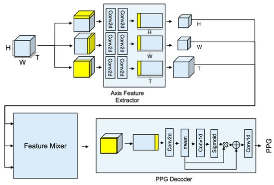 . The output of the feature extractor is combined through the feature mixer, and at this time, it is designed to create the optimal feature through various calculations. The optimal feature is transferred to a one-dimensional PPG block for generating the PPG. PPG block functions to decode the processed feature into a PPG of