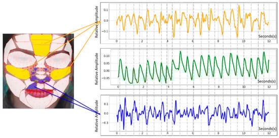 3]. rPPG is a video-based measurement method that measures changes in blood flow by analyzing the amount of light-diffused reflection information that is generated by changes in blood flow in the face. This approach benchmarks the principle of PPG sensors, but overcomes the problem in which a PPG may not be suitable for continuous monitoring, as the measuring device must always be used in a contact manner. Since the rPPG can be measured using a camera, it can effectively be used in any space, as a result of the spread of mobile devices and IOT devices that have cameras.