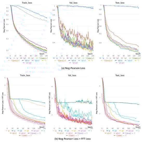 Figure 5 shows loss graphs of APNET. (a) shows that when only the neg-Pearson loss function is used, WT + T has the largest loss, and when only W and H are used, no training is performed. (b) uses neg-Pearson loss + FFT loss. The loss of T(W@H) +T is the lowest, and learning is not performed on W, H.
