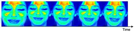 Figure 6 is the result of LRP. The closer the pixel value is to red, the higher the importance value of the deep learning network is evaluated. As a result of LRP, it can be seen that the forehead, glabella and malar regions were selected as the regions of interest, from among the regions that showed good performance in extracting the five types of PPGs mentioned in 4.2.2. It can be seen that the nose, which has a negative effect on learning, was evaluated as a region of interest.