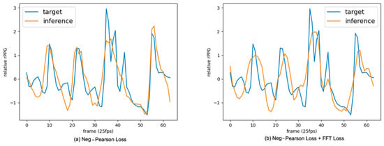 is the length of the signal. The neg-Pearson loss has the effect of learning the trend similarity and peak position. In previous studies, neg-Pearson was used to target the heart rate measurement using the trend and peak of the PPG. In this study, neg-Pearson + FFT loss was used as the loss, paying attention to the fact that the peak and notch of a PPG are needed to extract various information.