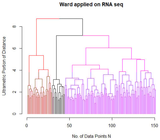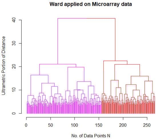 In the next step, hierarchical clustering, using the Ward algorithm, of the RNA-Seq data revealed three major clusters marked in the dendrogram in black in Figure 1, consisting solely of APL/AML M3 cases (Ward cluster 3). Beyond this separation, AML had two subgroups (magenta and red). In order to compare the RNA-expression-based AML clustering with the historical classification of the French–American–British group [], both classifications were aligned in Table 1. Within the first cluster of Ward, M1, M2, and M0 were predominant, and within the second cluster, M5. M4 was equally distributed, and for M6 to M8, only a few cases were available. FAB M3 is historically defined as APL, and was only found in Ward cluster 3. Hence, the Ward dendrogram for the AML patients without APL of the microarray dataset was also investigated. In line with the clustering results from the RNA-Seq data, the non-APL group revealed a cluster structure of two subgroups, as depicted in Figure 2.