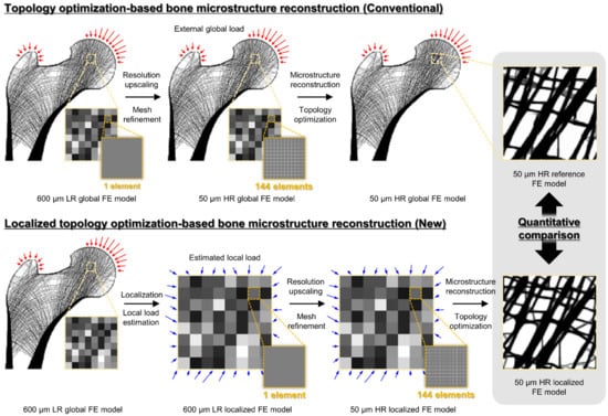 The primary principle of bone microstructure reconstruction using topology optimization is based on the similarity in structural behavior between continuum-level and micro-level models. A previous study reported that the stress and strain distributions of a micro-level containing bone microstructure could be reproduced well using continuum models []. Accordingly, the conventional method reconstructs the bone microstructure of the ROI based on topology optimization by considering the structural behavior of the global model under global loads. Note that the global model is an FE model representing the skeletal system, including cortical bone and cancellous bone, captured in LR. Global loads are external loads induced by the muscle force applied to the cortical bone of the global model.