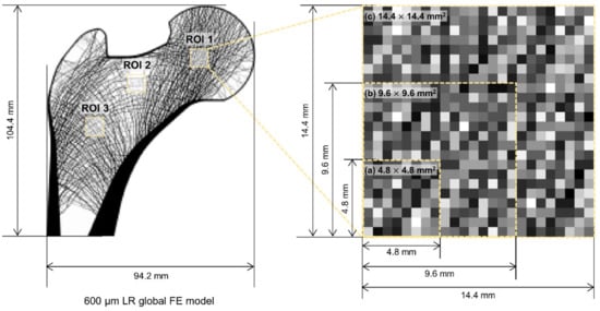 The conventional approach to bone microstructure reconstruction consists of two steps: mesh refinement and topology optimization. First, mesh refinement constructs a resolution-enhanced global model by dividing each element into n × n sub-elements as small as the representable size of the bone microstructure. Note that the element size is smaller than the average thickness of the trabecular bone of 100 μm. The elastic moduli of the sub-elements constituting the ROI and the other region are calculated using Equations (1) and (2), respectively. Equation (1) refers to a solid isotropic material using the penalization (SIMP) method [] to represent the micro-level material property. Equation (2) is the bone mineral density (BMD)–elastic modulus relationship in the literature to represent the continuum-level material property []. The Poisson’s ratio of all the elements was 0.3 [].