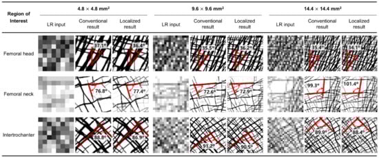 This study quantitatively demonstrated that the localized method accurately expressed the bone microstructure with high accuracy and has a high predictive performance for the actual bone microstructure. The bone microstructure formed via the localized method showed a very similar structure to the conventional method with the main trabecular alignment angle alignment difference of less than 2.1° and an error rate of less than 17.8% in the morphometric indices. Although slight differences in the shape and angle of some side branches exist, the effect of these differences is negligible since the structure of the main trabecular bone along the main trajectory in each ROI is responsible for the structural behavior of the bone. The overall prediction performance in the femoral neck region was lower than that in the other regions. Note that the addition or deletion of a single strut in the area can be exaggerated since the femoral neck comprises of only a few thin bone microstructures []. However, as seen from the comparison by ROI size, the bone microstructure can be predicted sufficiently well if the size of the selected ROI is sufficiently large.