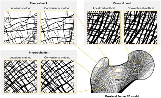 Moreover, the localized method also well depicts the characteristic trabecular patterns in the proximal femur with the conventional method as shown in Figure 5. The principal compressive group in the femoral head is well aligned along the hip contact force. The non-orthogonal intersection among the main trabeculae is well represented in the femoral neck. The orthogonal intersection among the secondary compressive and tensile groups is clearly described in intertrochanter. These results obviously indicate that the localized method has the same underlying principle as the conventional method. Note that topology optimization reconstructs bone microstructure to achieve maximum strength preserving minimum pixel-wise density difference based on the self-optimizing capabilities of bone.