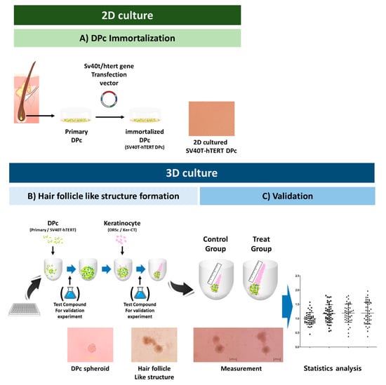 Recently, various studies have been published on the form of simulating hair follicles in an in vitro environment. Many studies on hair follicle structure neogenesis, including this study, have applied methods using the multicellular, multilayer forms of dermal papilla cell spheroids and keratinocytes. This method has the advantage of process simplicity, which benefits studies screening potential hair-promoting agents from a large compound pool.