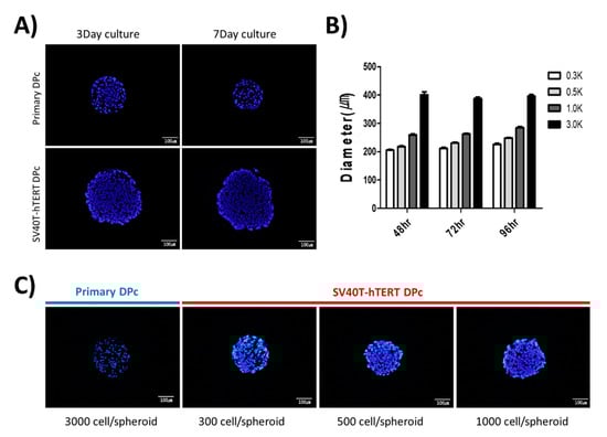 Spheroid aggregation pattern of human dermal papilla-derived cells. (A) Spheroid sections of primary DPc and SV40T-hTERT DPc using the same cell number (3000) for aggregation at two time points. (B) SV40T-hTERT DPc spheroid diameter changes over time for the initial cell population of each spheroid. (C) Comparison of SV40T-hTERT DPc spheroids in under 1000-cell populations with a primary DPc spheroid aggregated within 3000 cells after 72 h incubation. The cell density in the SV40T-hTERT DPc spheroids is higher than that of the primary DPc; however, the diameter of both types of spheroids is approximately the same. All sections were stained using DAPI.