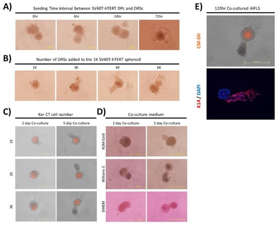 Optimal conditions for HFLS formation. (A) The time interval between the SV40T-hTERT DPc seeding for the spheroid formation and the start of co-culture with ORSc; approximately 1000 cells of SV40T-hTERT DPc and 3000 cells of ORSc were used. (B) Regulating co-cultured ORSc: Elongation of the keratinocyte layer in HFLS is prominent in the range of 3000–4000 ORSc. (C) Regulating immortalized keratinocyte (Ker-CT) cell numbers in HFLS composed of immortalized cells only: Addition of more keratinocytes results in larger iHFLS. (D) Variation of iHFLS formation according to culture medium regulation: iHFLS cultured in William’s E medium exhibits a more linear form than in other media conditions. (E) The cell arrangement in iHFLS using fluorescence observation: Cellular arrangement similar to hair follicles was observed using a cell tracker attached on SV40T-hTERT DPc and immunostaining of keratin 14 (K14) keratinocyte biomarker.