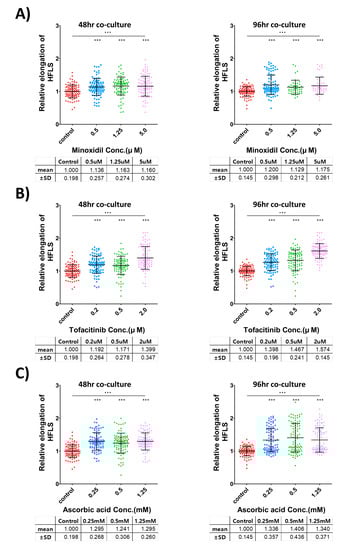 Validation of three known hair-promoting agents using iHFLS. (A) Relative iHFLS elongation measurement in the minoxidil treatment groups. (B) Relative iHFLS elongation measurement in the tofacitinib treatment groups. (C) Relative iHFLS elongation measurement in the ascorbic acid treatment groups. Every group showed statistically significant increased elongation compared with the control groups. *** = p < 0.0001 in the t-test, ∙∙∙ = p < 0.0001 in the one-way ANOVA analysis. The different color represents different concentration of treated agents.
