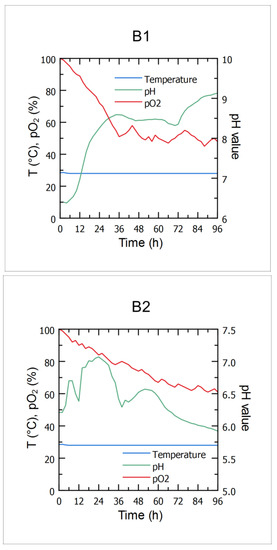 Cultivations of Bacillus sp. BioSol021 in a 16 L bioreactor - cultivation courses in terms of temperature, pH value and DO content using the food industry effluents-based media: B1—cheese whey from dairy industry, B2—winery flotation wastewater.