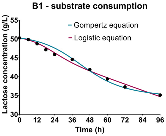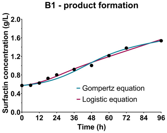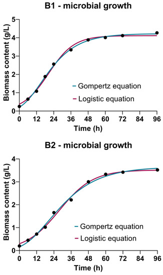 The bioprocess data on the producing microorganism’s biomass concentration, initial and residual sugar content in the cultivation media and surfactin concentration were used to generate kinetic models describing microbial growth, substrate consumption and product formation using non-linear regression analysis. The main microbial growth parameters (X0—initial biomass content (g/L), Xmax—maximal biomass content (g/L), μ—maximal specific growth rate (1/h)) were determined using the Gompertz (Equation (1)) and the logistic equation (Equation (2)):